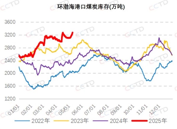 與此同時,5月份大秦線春季檢修結束后,港口調入量回升至偏高水平,但下游在庫存較為充足、煤價承壓下行的情況下,采購積極性偏低,港口調出量明顯低于調入量,港口庫存不斷累積,截至今日,環渤海港口庫存合計3272.3萬噸,再度刷新4月份因長時間封航產生的3266.6萬噸庫存記錄,較去年同期高947.3萬噸。